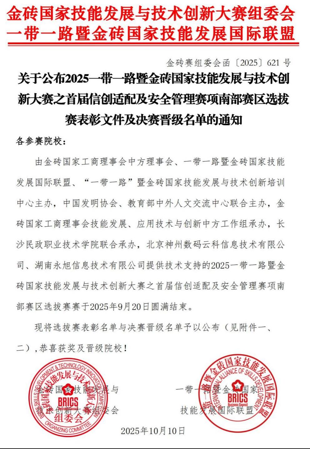 近日,从金砖国家技能发展与技术创新大赛组委会传来喜讯,在2025一带一路暨金砖国家技能发展与技术创新大赛之首届信创适配及安全管理赛项南部赛区选拔赛中,我校学子李博文、田昊凭借扎实的专业功底和出色的团队协作能力,成功晋级国赛。